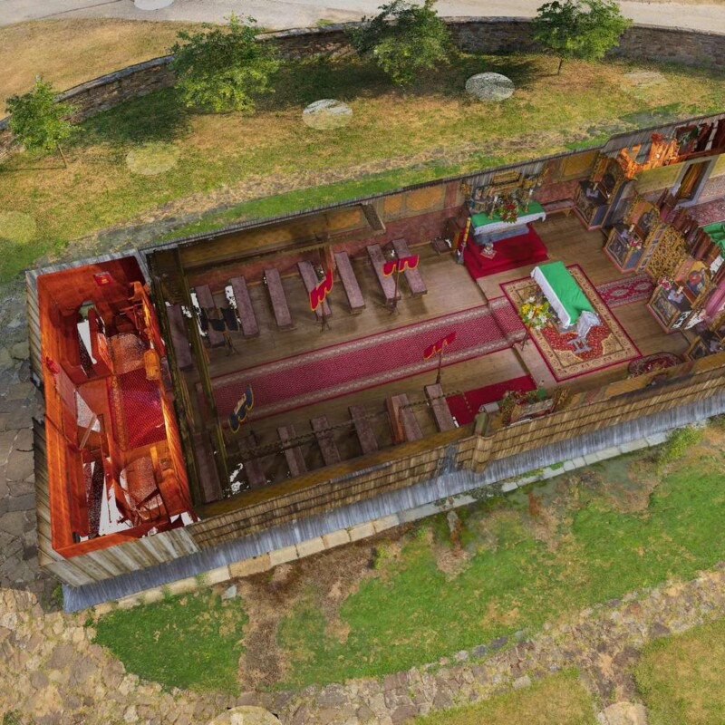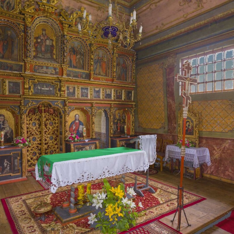 The walls and roof of the church are covered with shingles, that is boards overlapping each other. The chancel is 4 and a half metres wide, while the nave has a width of 7 metres. They are separated by a richly decorated iconostasis, that is a wall made of icons painted on boards. The frame for the paintings is formed by numerous columns entwined with carved golden vines.