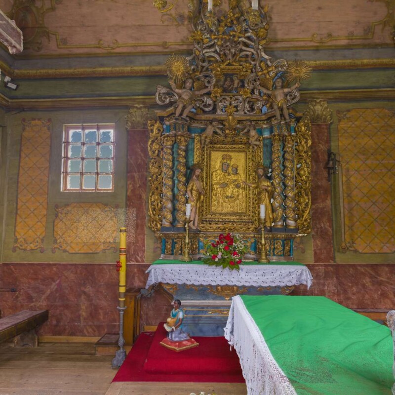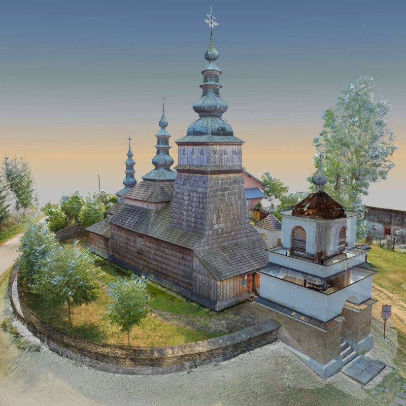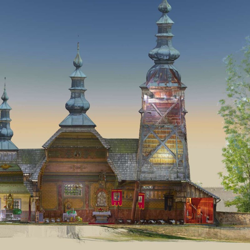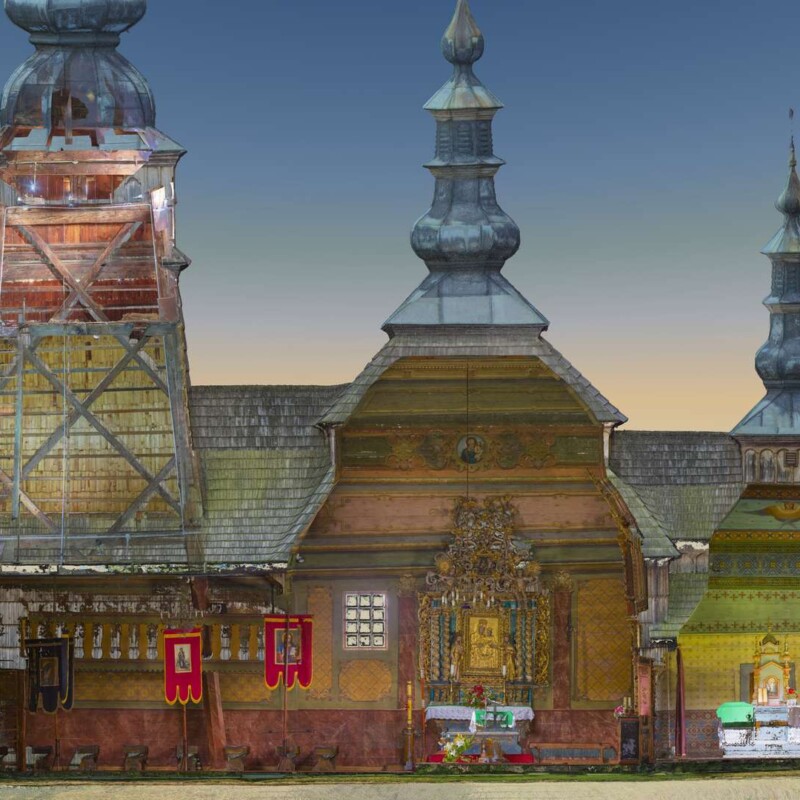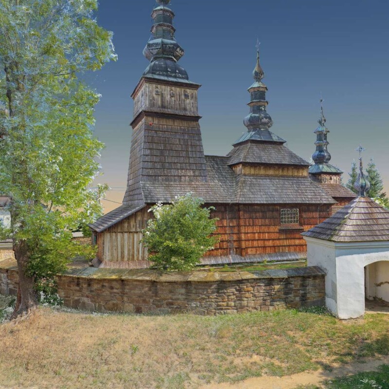 The church has a three-part structure typical of Lemko churches. In the middle is the nave where the faithful gather. It is the oldest part of the structure and dates from the 17th century. Adjacent to it from the east is the chancel, built at the beginning of the next century; this space is reserved for the clergy, and to the west a women’s gallery, with a vestibule, and an even younger tower above it. The fact that the chancel faces the east proves that the church, in line with the old tradition, is oriented. Oriens in Latin means east. This is where the Saviour is to reappear at the end of the world. The nave and chancel are of a log frame construction. The sturdy beams are stacked horizontally on top of each other and connected at the corners. In this way, the walls of the building were created. The tower has a column-frame structure composed of vertical columns and horizontal beams.