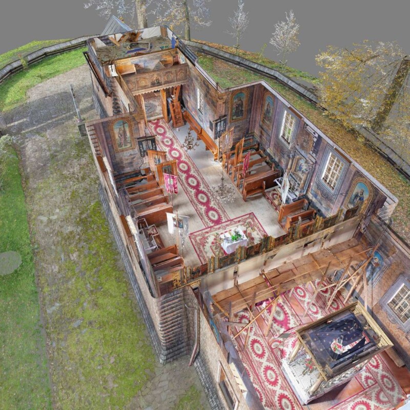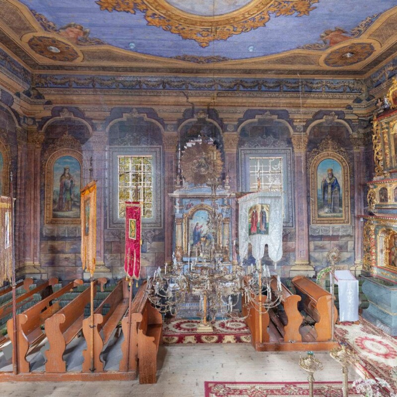 Między nawą a prezbiterium wznosi się przegroda pełna ikon, czyli ikonostas. Zawiera cztery poziome rzędy ikon. To obrazy malowane na desce. Pierwszy rząd od dołu to ikony miejscowe. Przedstawiają najbardziej szanowanego na Łemkowszczyźnie Św. Mikołaja, Matkę Bożą z Dzieciątkiem, Chrystusa Nauczającego z Ewangelią, oraz ikonę dotyczącą wezwania świątyni. W tym wypadku to ikona pod tytułem Opieka Matki Bożej, czyli Pokrow. To welon, którym Maria ochrania wiernych zgromadzonych przy niej.