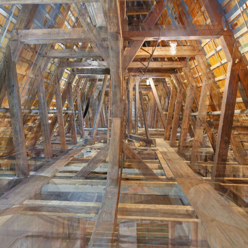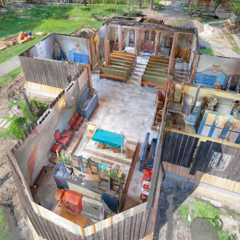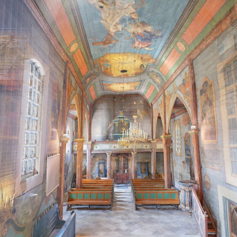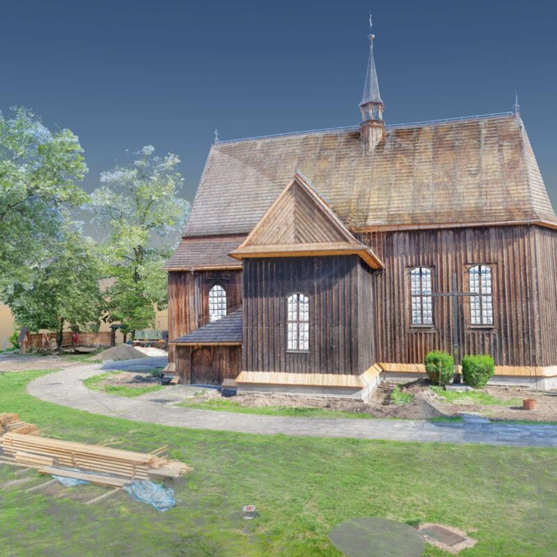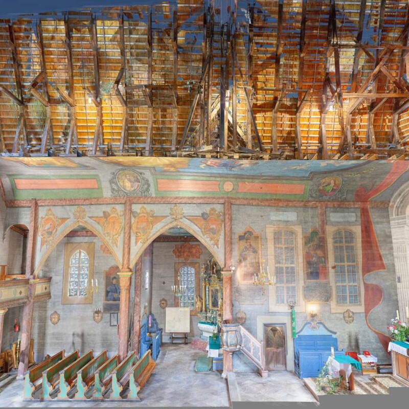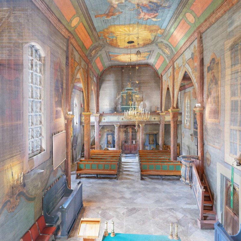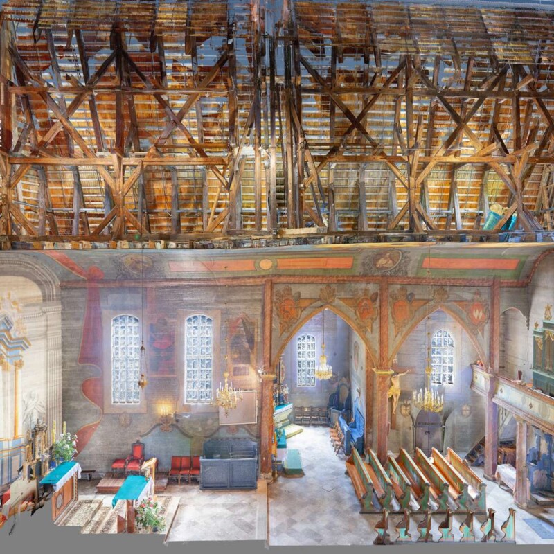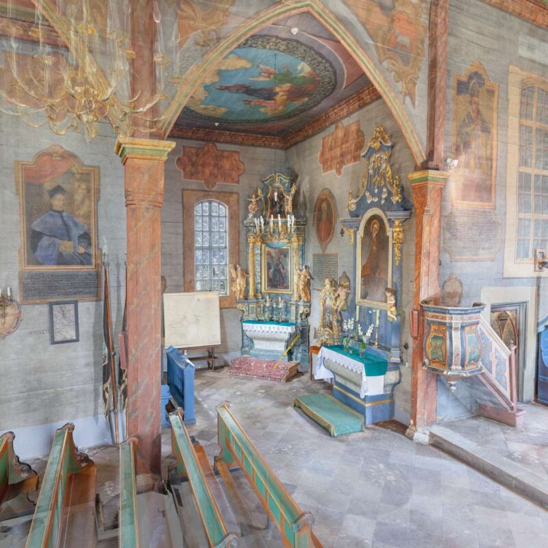 Ściany zostały więc wykonane z solidnych belek, ułożonych jedna na drugiej. Połączono je w narożnikach specjalnymi nacięciami, tak zwanymi zamkami ciesielskimi. W ten sposób powstała budowla składająca się z dwóch części: prezbiterium i nawy. W prezbiterium, czyli miejscu sprawowania mszy, ustawiono ołtarz. W przeznaczonej dla wiernych nawie znajdują się ławki. Prezbiterium zostało skierowane na wschód, gdzie, jak wierzą chrześcijanie, na końcu świata ma pojawić się ponownie Zbawiciel. Takie rozwiązanie nazywa się orientowaniem kościoła.