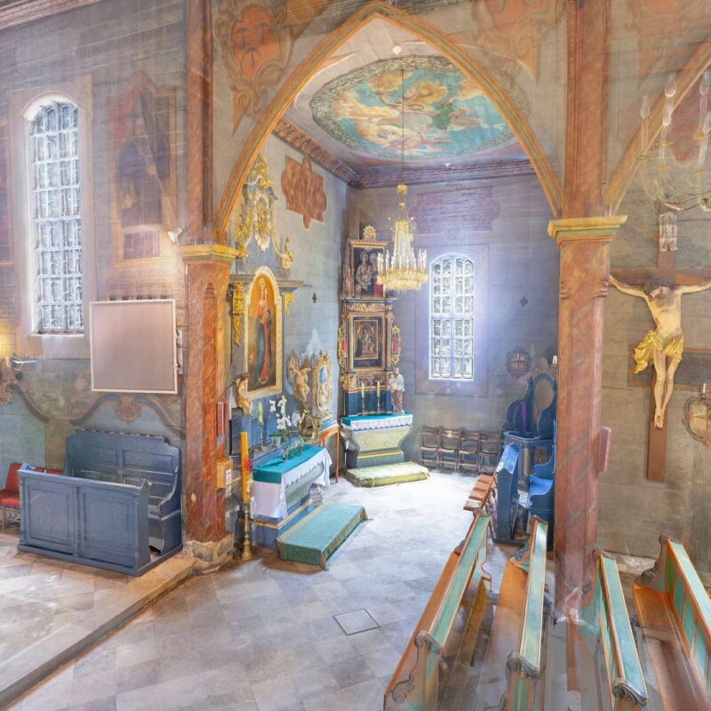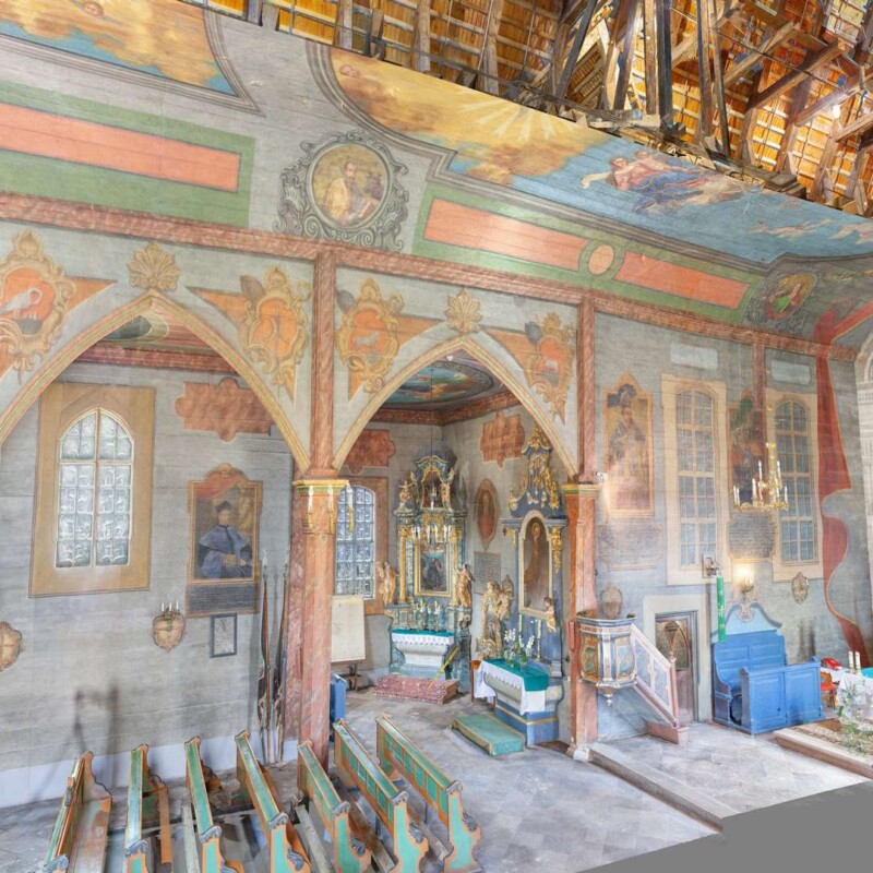 Do nawy dobudowano od północy i od południa dwie czworoboczne kaplice. Wszystkie dachy pokryto gontem, czyli niewielkimi deseczkami. Okna są wysokie, dość wąskie, złożone z wielu szybek i półokrągło zwieńczone. We wnętrzu zachwyca świetna kompozycja ściennych malowideł szczelnie pokrywających ściany i stropy. Postaci aniołów i świętych, a także herby wpasowano w kształt łuków arkad.