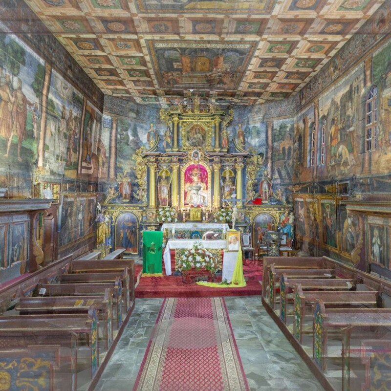 Wieżyczka z dzwonem, czyli sygnaturka umieszczona jest pośrodku górnej części dachu. Wnętrze urzeka doskonale rozmieszczonymi malowidłami ściennymi, czyli polichromiami. Pokrywają one ściany, sufit i chór. Na stropie przeważają liczne elementy przypominające kasetony. W architekturze kasetonem określa się czworokątne zagłębienie w ścianie lub suficie. Środek kwadratów zdobią różne kwiaty. Przeważają kolory żółty, zielony, pomarańczowy. Pomiędzy kasetonami znajduje się kilka prostokątnych obszarów. Przedstawiono tu sceny z życia św. Jana Chrzciciela. Zdobią one także ściany. Postaci są niemal naturalnej wielkości. Ukazano między innymi takie momenty, jak: zwiastowanie Zachariaszowi, nawiedzenie św. Elżbiety, głoszenie do ludu, rozmowy z faryzeuszami. Nie zabrakło tragicznego końca życia proroka, czyli słynnej sceny z jego uciętą głową na tacy.