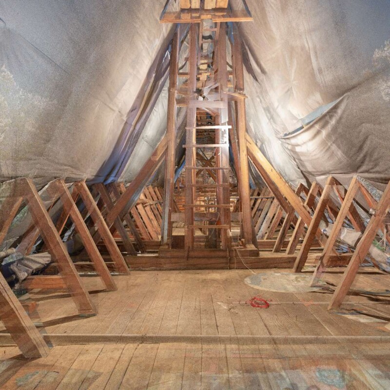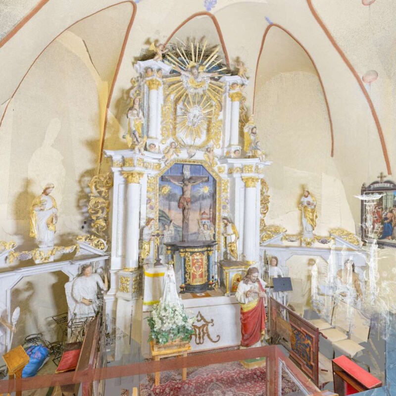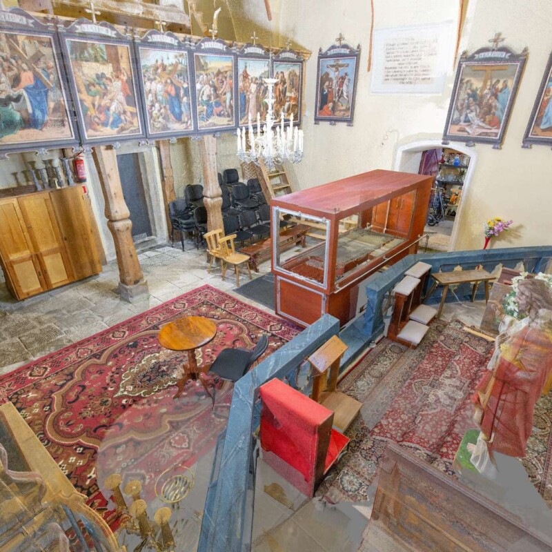 W dolnej części ścian, od podłogi do wysokości dorosłego człowieka ciągnie się pas malowideł z serią wizerunków biskupów. Ukazano ich od pasa w górę. W kompozycji ołtarza głównego najbardziej poruszającym elementem jest centralnie usytuowana Pieta. To rzeźba ukazująca siedzącą Matkę Bożą. Na jej kolanach spoczywa martwe ciało umęczonego Zbawiciela. Drewnianą, malowaną rzeźbę umieszczono na czerwonym tle, w półokrągło zamkniętej niszy. Zarówno siedząca Maryja, jak i Jezus mają na głowach złote korony z krzyżami. Od koron rozchodzą się na różne strony ostre, złote promienie.