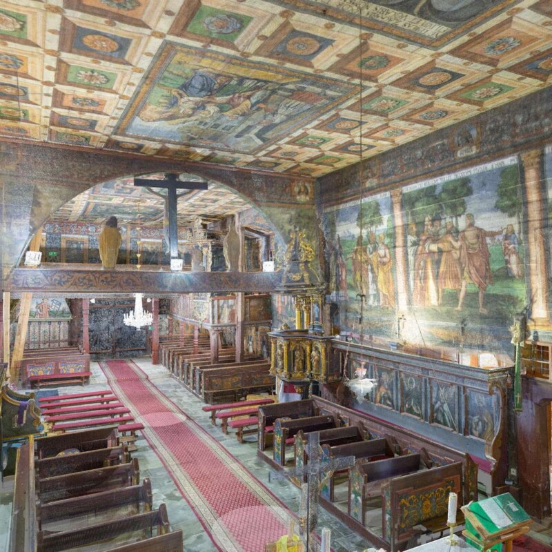 Oznacza to, że ściany zbudowane są z ułożonych poziomo belek. Połączono je w narożnikach nacięciami – zamkami ciesielskimi. W pierwszej połowie XVIII wieku do prezbiterium dobudowano od wschodu murowaną kaplicę Matki Bożej Bolesnej. Wieżę połączono z nawą od zachodu na początku XX wieku. Unikatowy wystrój malarski prezbiterium i nawy pochodzi z XVII i XVIII wieku. Malowidła przedstawiają sceny z życia św. Jana Chrzciciela, medaliony z Chrystusem i apostołami oraz galerię wizerunków świętych czczonych na Węgrzech. Jako ornament występują motywy roślinne. Ciekawostką są też ilustracje Dziesięciorga Przykazań, umieszczone na balustradzie chóru.